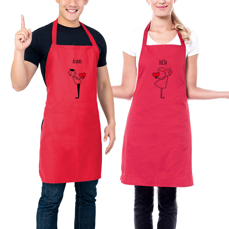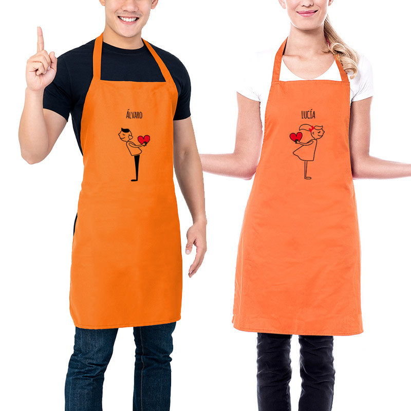 Los delantales llevarán vuestros nombres personalizados junto a un divertido dibujo de chico y chica tirando un beso.